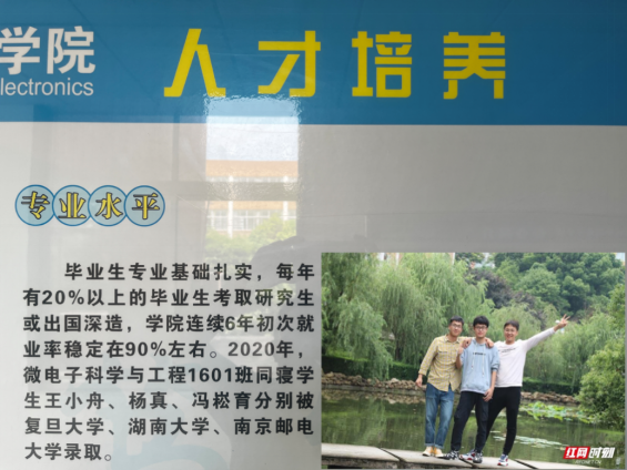近年来,微电子科学与工程专业毕业生深受省内集成电路设计制造企业和珠三角电子科技类企业的欢迎,形成了稳定的校企合作协同育人就业模式,员工就业率稳定在90%以上。员工考取复旦大学、电子科技大学、华南理工大学、南京邮电大学、湖南大学、北京工业大学、四川大学、都柏林大学等高校集成电路专业研究生60余人,专业应届生考取硕士研究生20%左右。