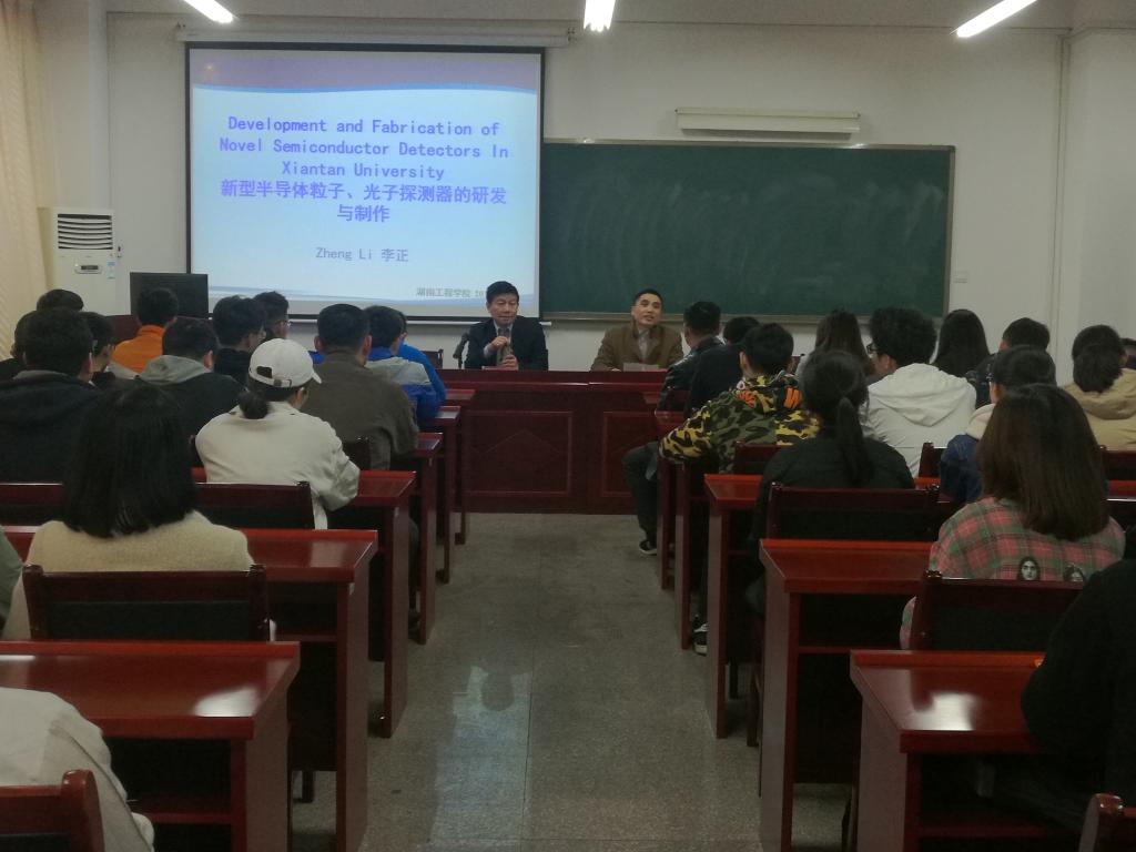 为提高公司师生的创新意识;营造公司科技创新的氛围;带动和提高同学对学科前沿问题、热点问题的关注;激发同学对于专业学习的兴趣以及树立远大的理想与目标。在科技处和理公司邀请下,湘潭大学“千人计划”李正教授2019年3月27日下午2:40在新校区F205作了主题为“新型半导体粒子、光子探测器的研发与制作”的学术报告。
