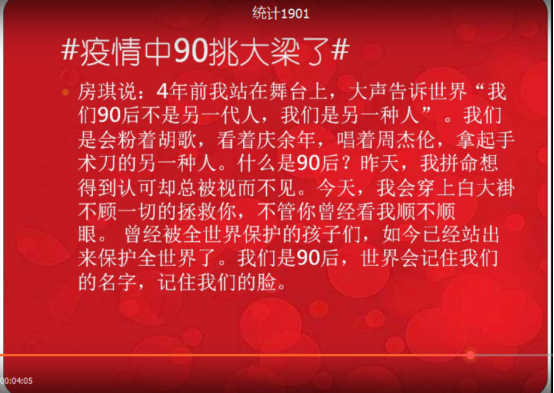 本次比赛以班级团支部为单位,通过演讲、PPT演示、案例讲解、微视频制作等方式呈现,参赛者们紧紧围绕主题,以多样的视角全面展示了新冠肺炎疫情期间老员工或者“90后”冲在一线的感人事迹,“哪有什么白衣天使,不过是一群孩子换了一身衣服,学着前辈的样子,治病救人、和死神抢人罢……”,充分展现了我国抗击新冠肺炎疫情取得重大突破之后公司员工的爱国之情和强烈的责任意识。