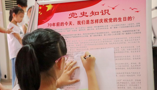 在每个社区宣讲现场,都能看见志愿者们设立的“流动党史馆”宣传长廊。在东方红广场,居民围绕在展板面前了解红色故事,及习近平新时代中国特色社会主义思想的有关内容,现场居民纷纷为志愿者豪情壮志的宣讲热烈鼓掌。在桥湾社区,志愿者们热心给居民和孩子讲解“流动党史馆”中的内容;在宝塔社区,志愿者们组织社区居民及青少年举办了“我和我的祖国”演讲比赛;在盘龙社区,志愿者们给社区青少年举办了“红色故事”演讲比赛,在社区设置了“物理小实验”、“红色故事馆”、“庆祝祖国70周年”祝福墙以及“红色知识”抢答比赛等环节。