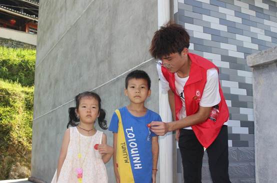 图为实践团成员为小朋友们佩戴毛主席徽章。中国青年网通讯员 任格仪 摄