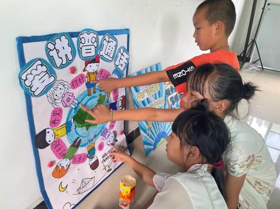 图为实践团成员和小朋友们一起制作推广普通话的海报。中国青年网通讯员 任格仪 摄