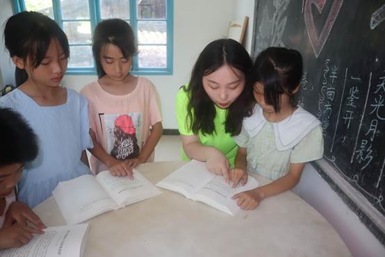 图为实践团成员教小朋友们朗读句子。中国青年网通讯员 陈妮娜 摄