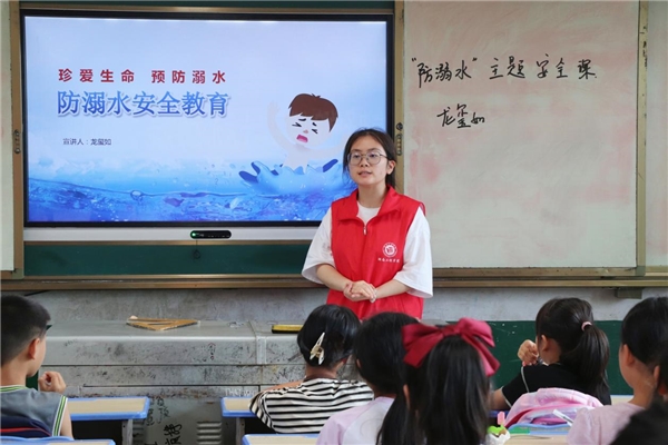 图为实践团成员给留守儿童讲述防溺水的安全知识。李韩辉 摄