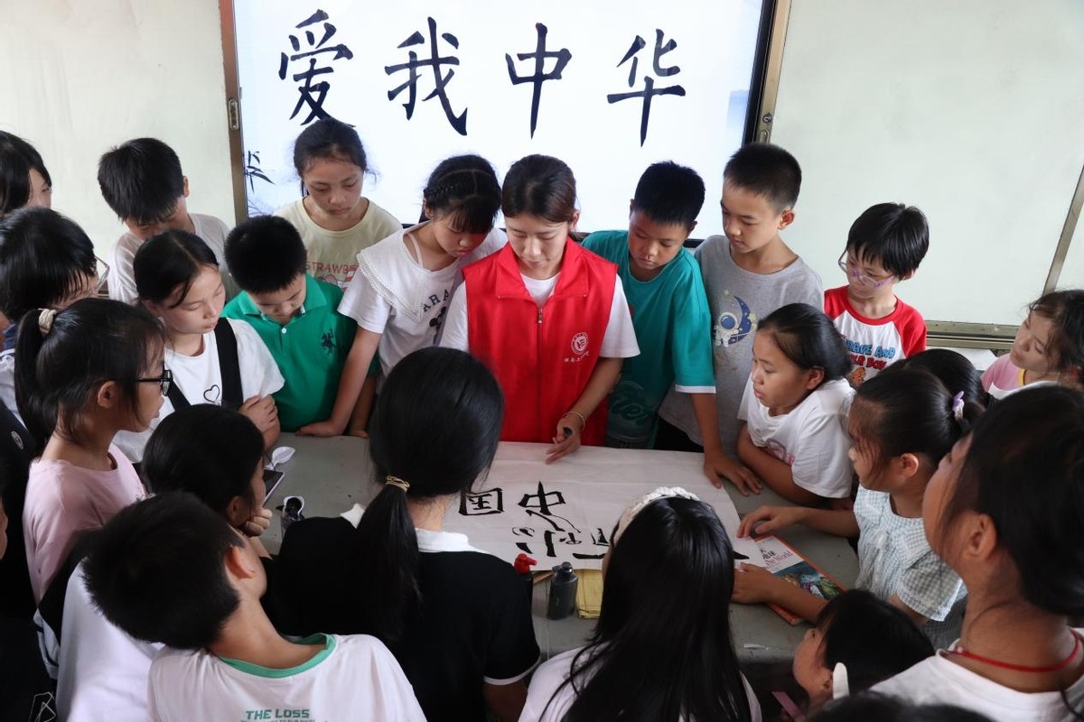 弘扬传统文化 厚植家国情怀。中华文化源远流长,中华文明博大精深。7月15日,实践团成员通过开设传统书法课、传统手工制作、剪纸等红色主题传统文化课,让小朋友们身临其境地体验和感受中华艺术之美,让中华文化在田野沃土的滋养下而枝繁叶茂。传统书法课堂上,小朋友们在老师的指导下学得有模有样,认真书写了“爱我中华”四个大字,心中蕴含着对党和国家无尽的热爱和自豪,抒发浓烈的爱国之情,营造“向上,向善,向美”的浓厚文化氛围。