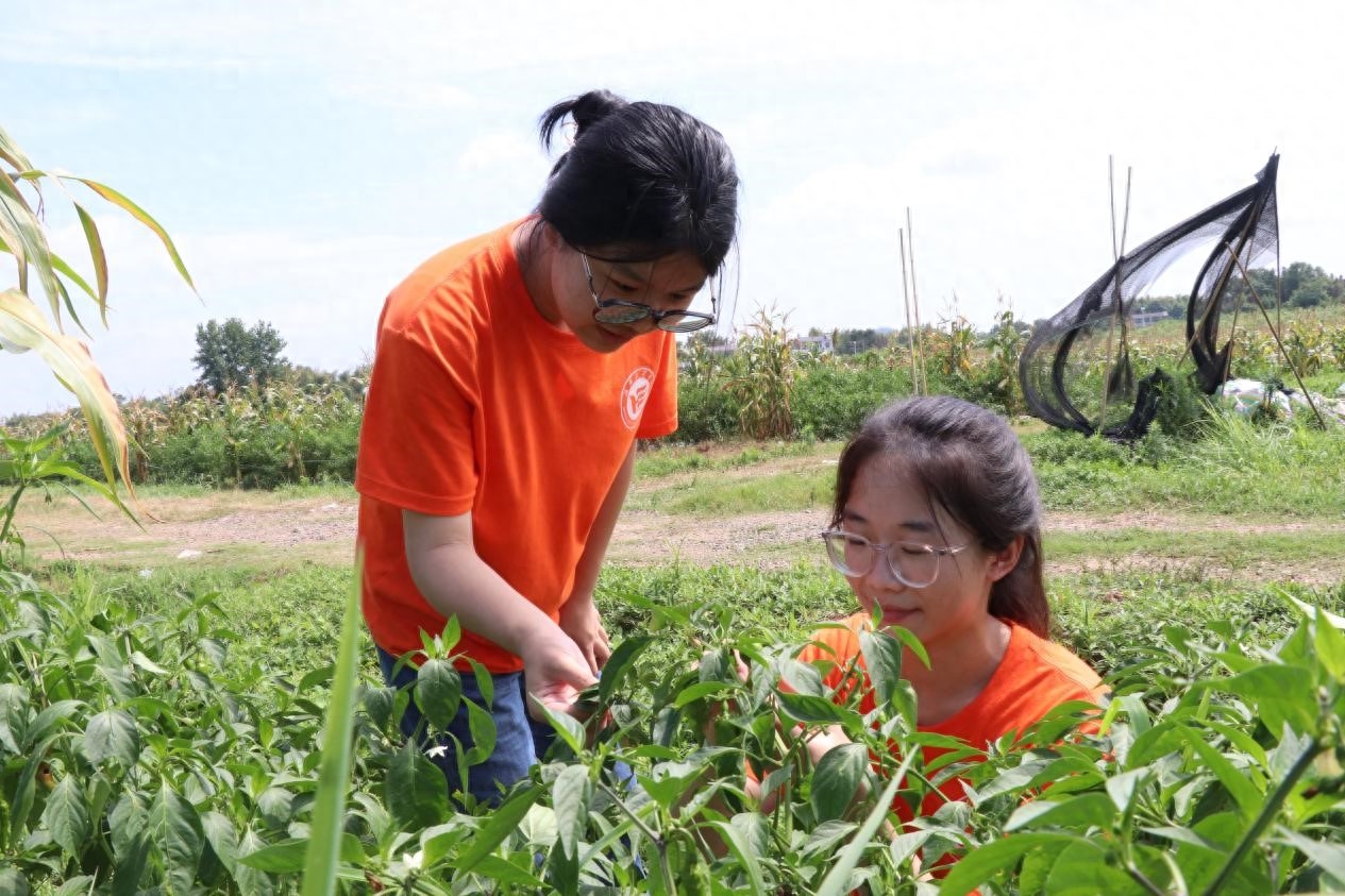 图为实践团成员在辣椒产业园体验摘辣椒 李韩辉 摄