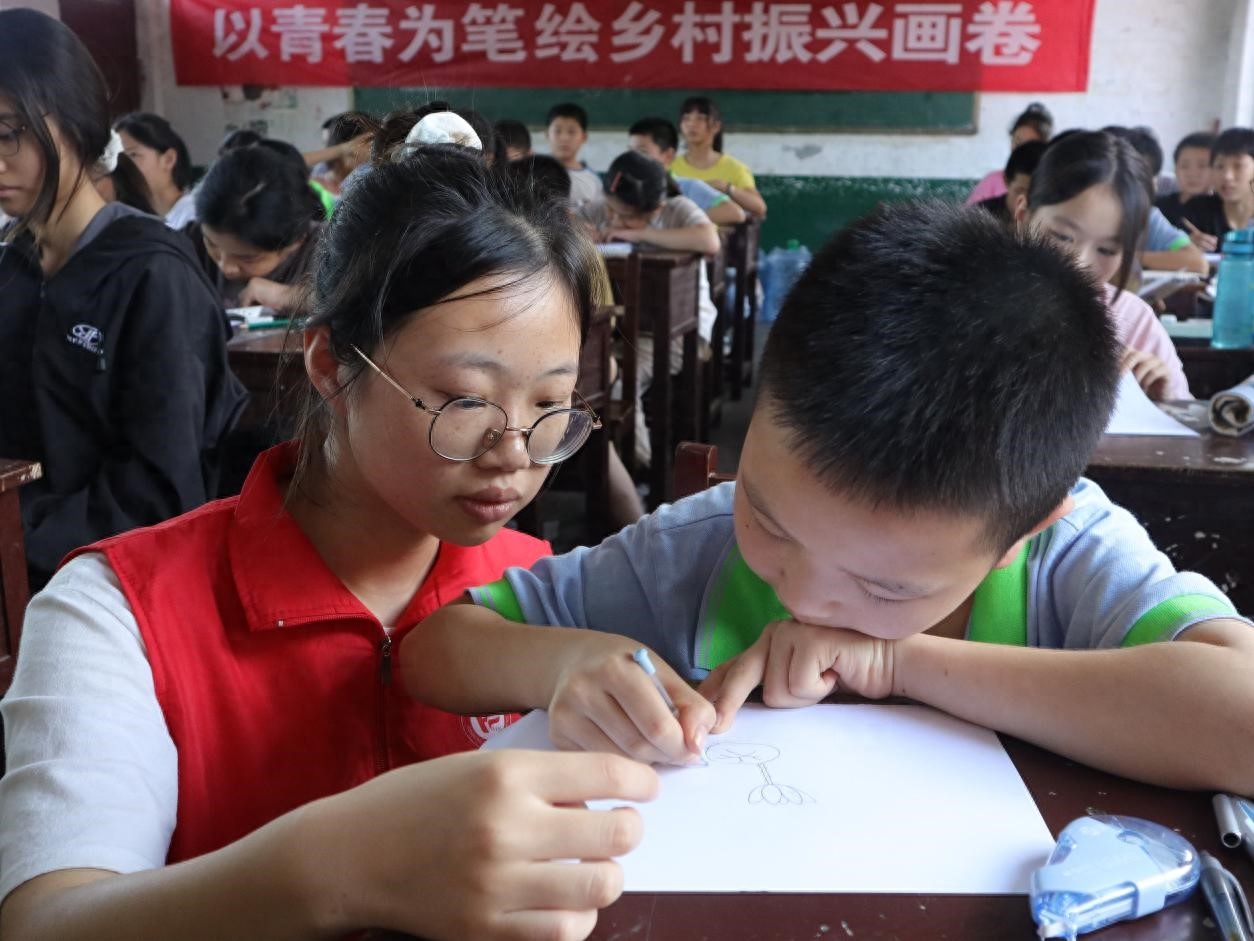 图为实践团成员教小朋友绘画推广普通话海报。龚艳星 摄