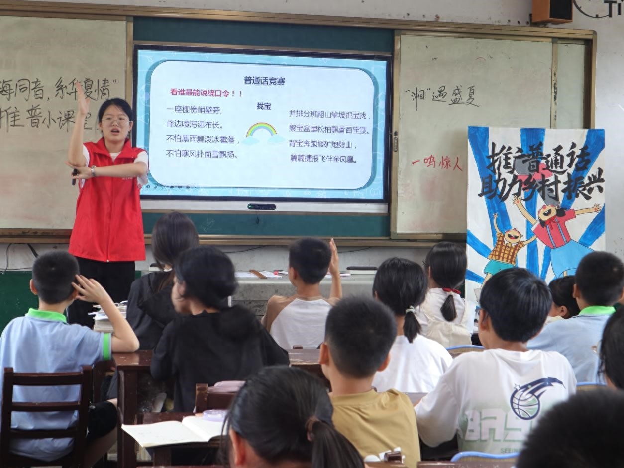 力乡村振兴”社会实践活动。开展了“四海同音,系华夏情”推普小课堂、“推广普通话 助力乡村振兴”绘画课、“红色诗韵”趣味诗集会、“星星向党,共成长”红色故事分享会、“聚力一夏”红色文艺汇演等相关语言文化活动,融入诗词比拼、情景对话、绕口令比赛、中文歌曲学习等新型教学方式。根据当地实际情况,为当地员工、居民进行“一对一”辅助普通话教学和系统培训,发放普通话宣传手册、调查问卷。通过推普活动,引导青年老员工在实践中摸真情况、求真学问、练真本领,为中华文明的发展贡献出青春力量。