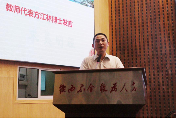 2024届毕业班班主任方江林作为教师代表发言。他强调了梦想和坚持的重要性,引导员工潜心提高学习本领,努力追逐梦想,成就更高质量的人生。