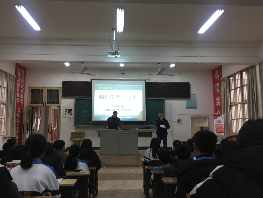 授牌仪式后,邓永和给高中生们介绍了beats365官方网站的发展历史、办学特色、优势专业情况,并重点介绍了合作基地公司的招生政策,欢迎韶山公司的员工报考beats365官方网站。接着,开始作《物理学者与人才》专题科普讲座。从爱因斯担、牛顿、德拜等物理学大家到物理学预言,物理学者的成长故事深深打动了高中生们,他们明白了,只有通过分析研究、独立思考、磨砺意志、担当责任,才能成就自我。科普讲座赢得了孩子们的阵阵掌声。