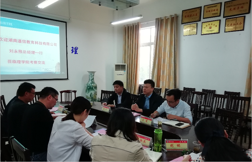 5月14日上午,湖南道信教育科技有限公司总经理刘永照、副总经理王建、湘潭分校董事长魏威一行三人来到理公司洽谈校企合作,理公司经理邓永和、党总支书记刘洁纯、党总支副书记陈亚琼、两办主任、就业专干一同在G207会议室参加了洽谈会。双方共同探讨了校企合作的具体形式和内容。