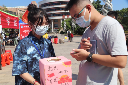 “同学,要不要来一次党史知识有奖抽题?为你们准备了精美的小礼品哦!”由员工党员和”青马青语“宣讲团组成的志愿者们在迎新点热情地询问,吸引了大批感兴趣的新同学,抽题箱前围满了人,新生在党史知识面前大展身手。