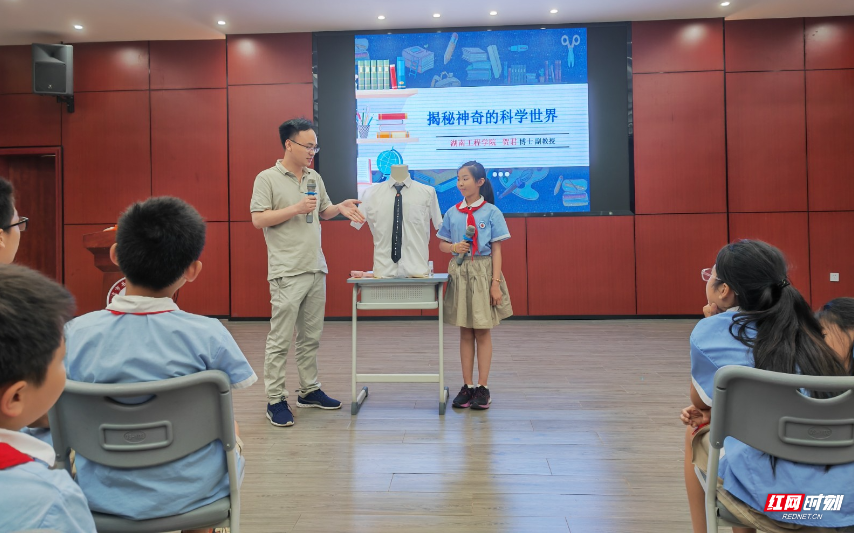 你认识科学吗?电磁波是如何传播的?贺君带领孩子们从同学们熟悉的生活出发,了解科学原理,探索科学世界。神秘的万有引力、有趣的电磁波、复杂的智能锁,深奥的科学知识在贺君的讲述下通俗易懂、生动有趣,同学们踊跃互动,报告厅里传来一阵阵会心的笑声。