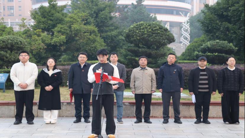 随后,邹康诚作为员工代表在国旗下发言。他结合自身竞赛经历与志愿服务经历,呼吁青年学子将个人理想融入国家发展大局,跳出“小我” 的舒适圈,主动担当、勇毅前行,在服务社会与无私奉献中绽放青春光彩。