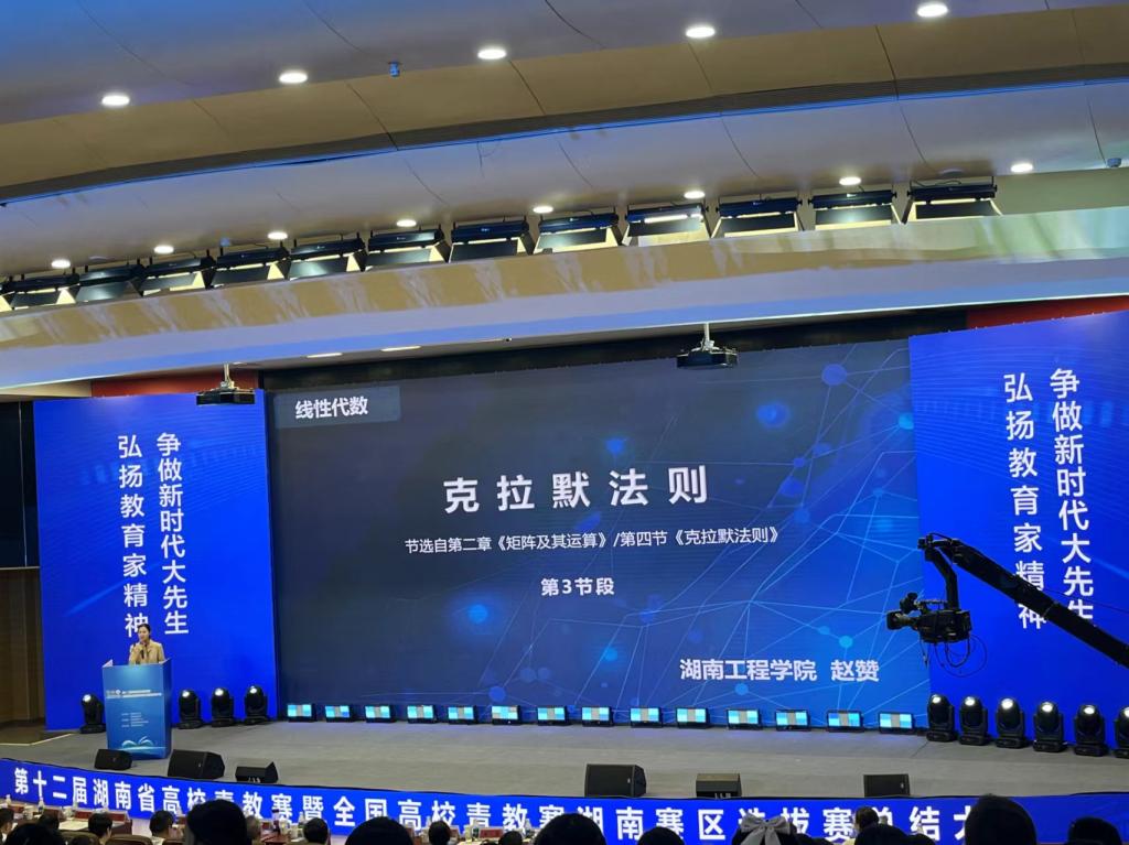 2024年6月24日上午,由湖南省总工会和湖南省教育厅联合举办,湖南省教育工会和湖南省教育科学研究院承办的第十二届湖南省高校青年教师教学竞赛暨全国高校青年教师教学竞赛湖南赛区选拔赛在湖南中医药大学圆满落幕。公司青年教师赵赞,经过校赛、省级复赛顺利进入决赛,最终以理科组第三名的成绩荣获一等奖,并被授予“湖南省教学能手”荣誉称号。上午9时,大赛的总结大会在湖南中医药大学准时召开,在理科组专家中南大学党委常委、副董事长何军教授点评本次“青教赛”理科组课堂后,公司青年教师赵赞作为优秀青年教师代表,为全场观众带来《线性代数》的课堂教学片段分享。